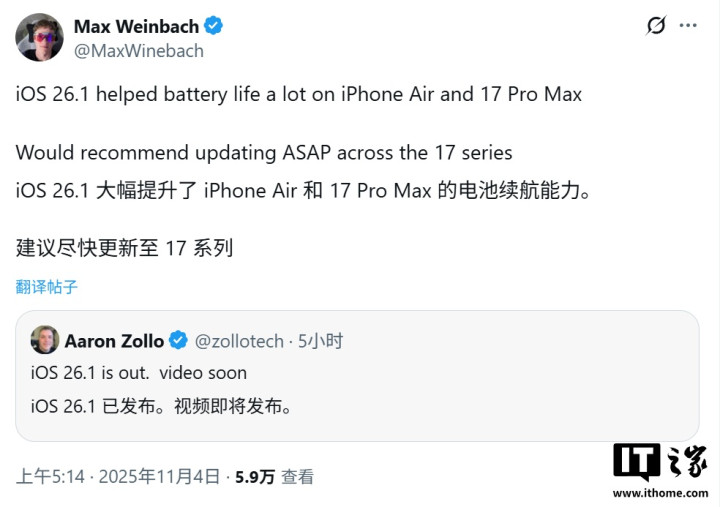 科技博主MaxWeinbach表示,iPhoneAir和iPhone17ProMax机型升级iOS26.1系统之后,明显能感受到续航方面的提升,并建议iPhone17系列用户尽快更新。
