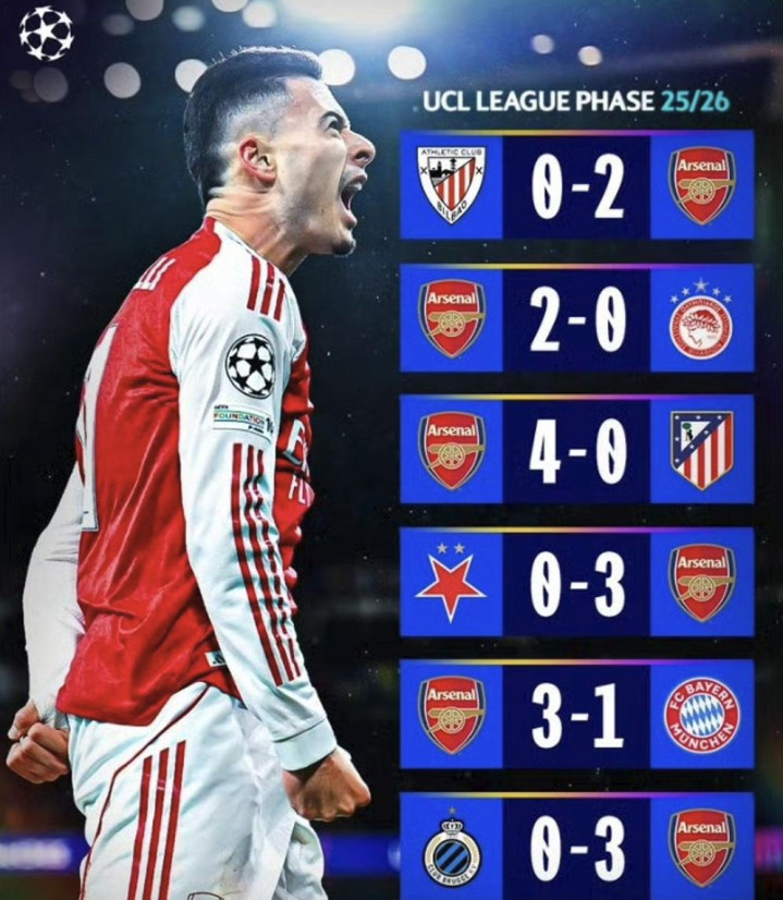 而阿森纳则已成为英超新门面,在欧冠第6轮中,阿森纳凭借马杜埃凯的梅开二度,以及马丁内利的进球,在客场以3-0轻取布鲁日。而此前布鲁日曾在主场3-3战平巴萨,4-1大胜法甲豪门摩纳哥。欧冠还剩2轮,阿森纳6连胜进17球只丢1球领跑,其中包括赢下2场强强对话,3-1拜仁,4-0马竞。