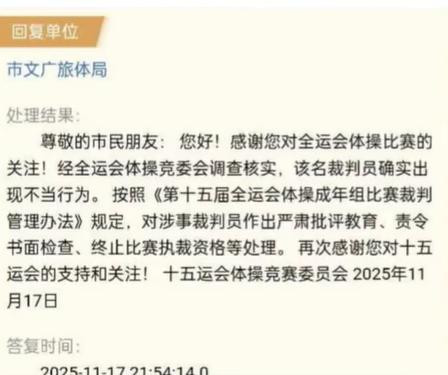 11月18日,现场观众告诉记者,11月17日晚,十五运会体操竞赛委员会回复了她:该名裁判确实出现不当行为,按照规定,对涉事裁判员作出严肃批评教育、责令书面检查、终止比赛执裁资格等处理。